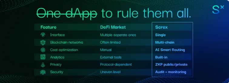 Umesto da korisnik mora da koristi više aplikacija: jednu za swap, drugu za lending, treću za staking — SCREX obećava da sve to objedini u jedinstvenom, intuitivnom interfejsu. To znači manji broj aplikacija za koje morate da brinete, manji broj mostova koje morate da koristite i bolju korisničku iskustvo.